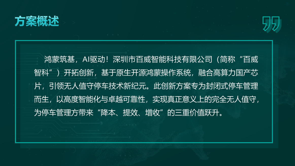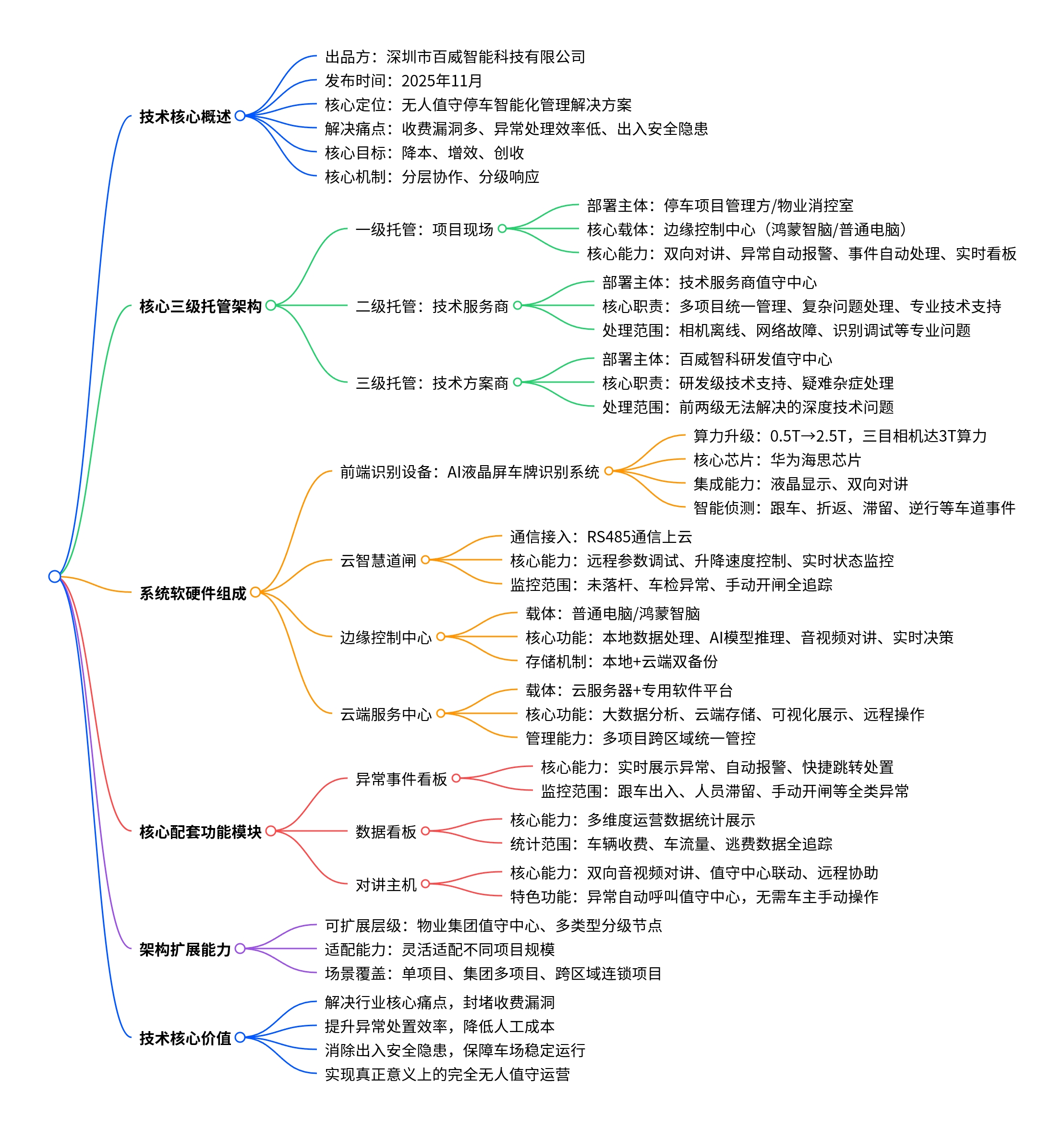 本方案是深圳市百威智能科技有限公司2026 年推出的,基于原生开源鸿蒙操作系统、融合高算力国产芯片与 AI 技术打造的全栈式无人值守停车解决方案,专为封闭式停车管理场景设计,采用端 - 边 - 云三层协同物联网架构,具备自主可控、离线强自治、全链路财务安全、收费漏洞全方位封堵等九大核心优势,配套全栈国产化核心硬件,相较传统停车方案实现了系统可靠性、安全防护、运营效率的全面突破,最终为管理方实现降本、提效、增收的核心价值,可广泛适配园区、商业体、小区、医院等多类停车场景。